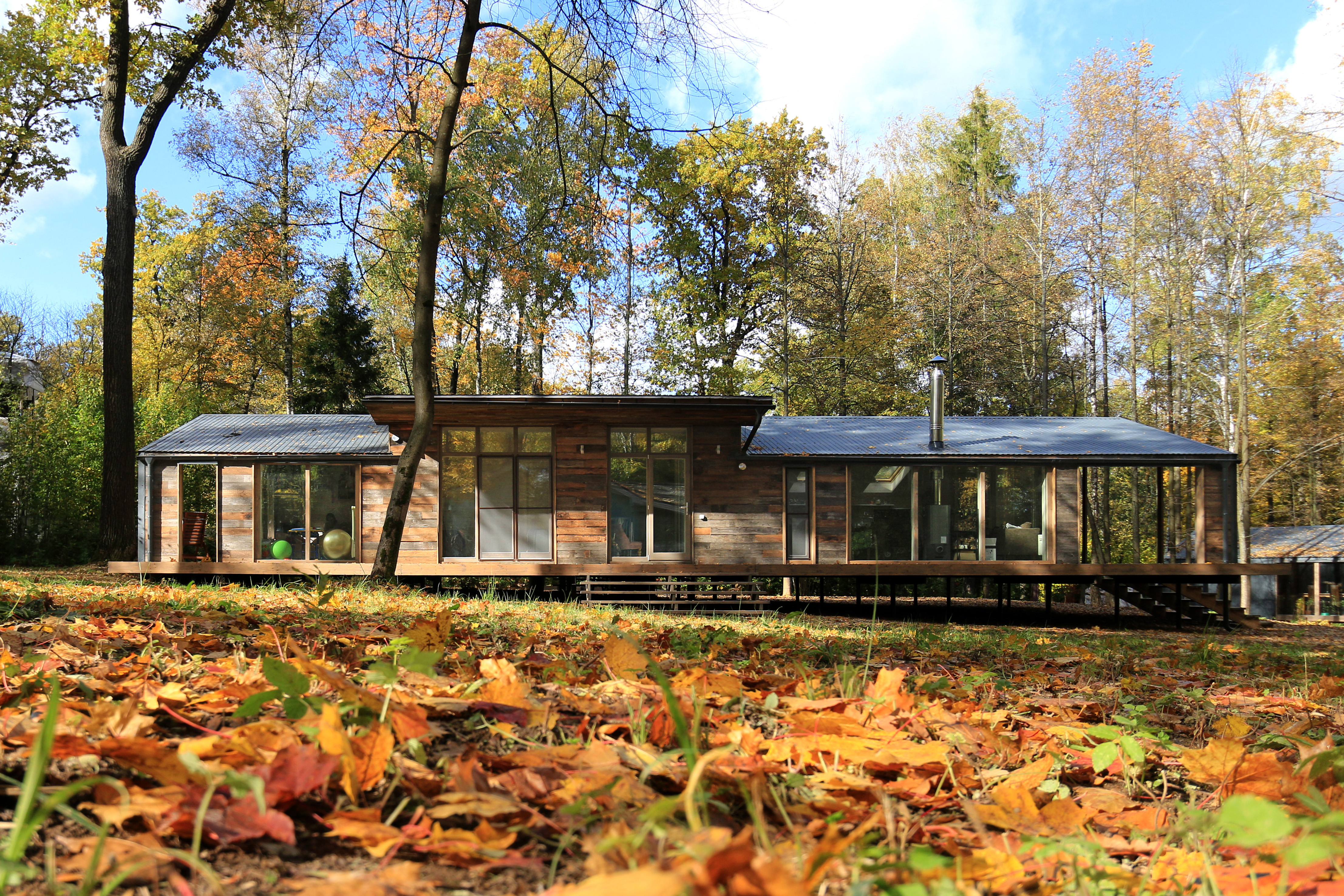 Дом находится недалеко от Москвы, но из-за застекленного фасада, обращенного к лесу, создается ощущение, что ты на дикой реке где-то в лесной чащи. Ветер разворачивает дом в разные стороны и картина за окном все время меняется.