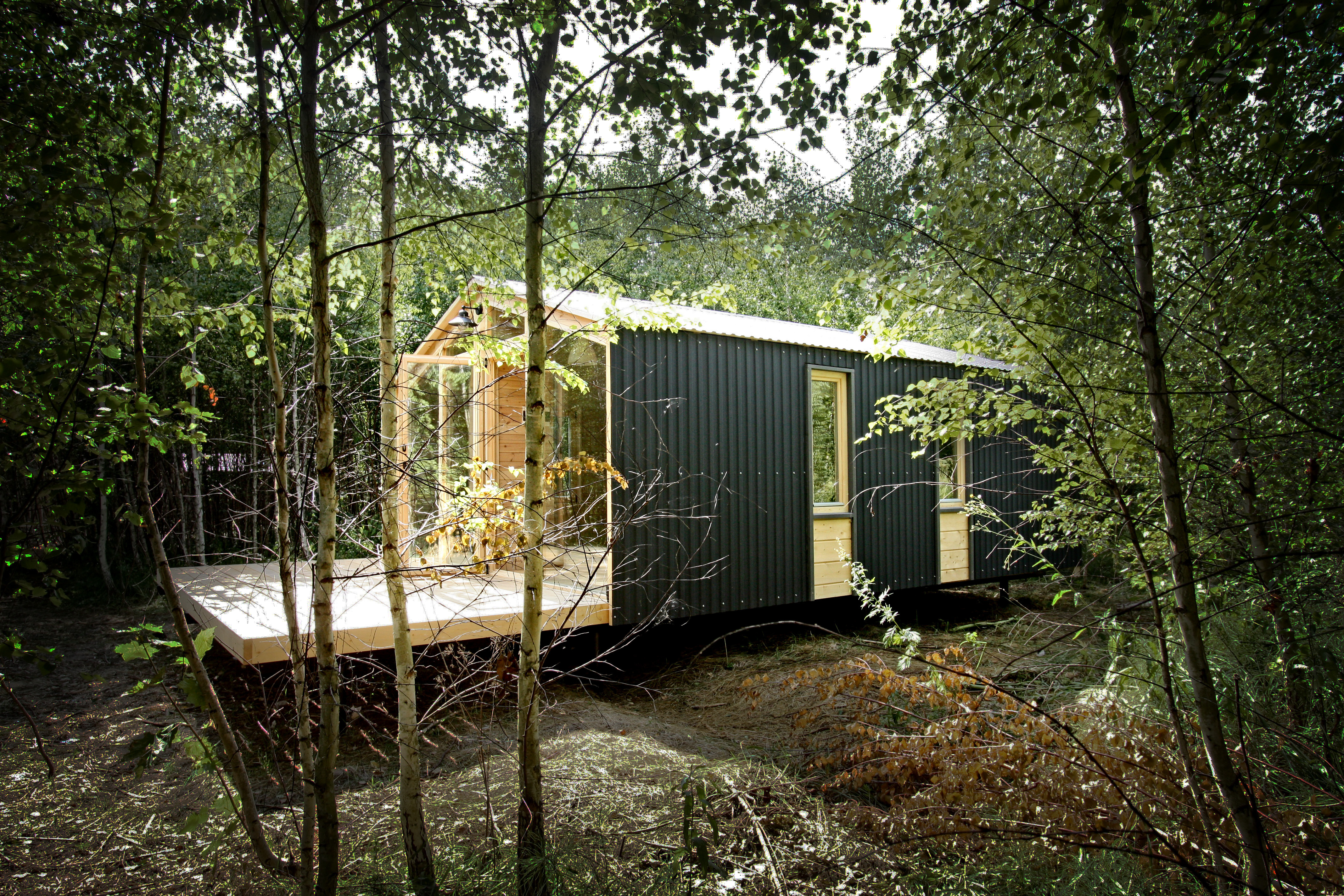 Хотя дом DD16 от BIO Architects оказался компактным, внутреннее пространство сохраняет домашний уют. В кабине есть санузел с душевой кабиной, двуспальная кровать, обеденный стол и открытая площадка, на которой можно установить дровяную печь.
