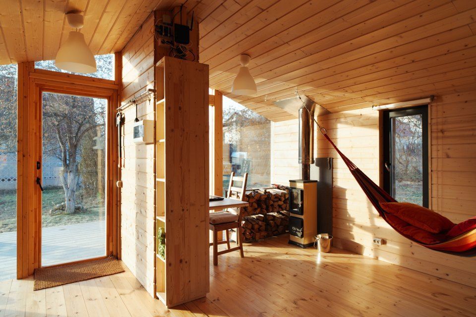 Домик очень теплый, и тому есть простое и понятное объяснение. Маленькую площадь гораздо легче и быстрее обогреть. Кроме того, в таких простых конструкциях, где нет лишних углов и замысловатых форм, проще установить качественную теплоизоляцию.