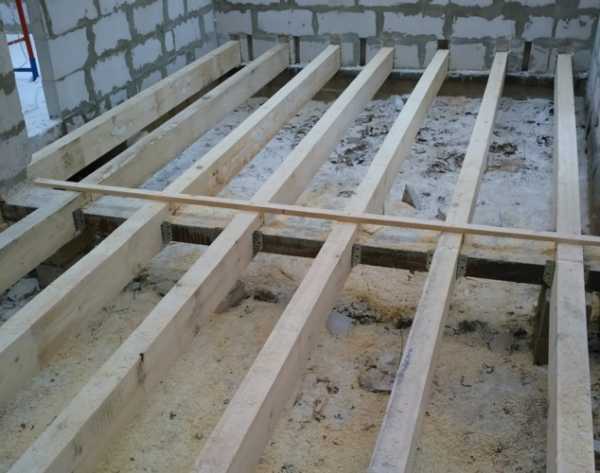 При большой длине балок или лаг делают еще промежуточные перемычки для более стабильной геометрииЧерновой пол по лагам под стяжку (плавающий пол)