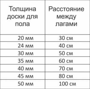 Под доски толщиной 35 мм расстояние между лагами составляет не менее 50 см, 35-40 мм – 80 см, более 40 – 100 см