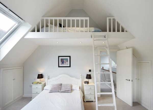 Первый этаж частных домов и помещение современных квартир все чаще представляет собой студию, в которой необходимо разместить сегменты гостиной, кухни и столовой. В случае если отдельной комнаты для оборудования спальни нет, а высота потолка позволяет обустроить верхний уровень, было бы ошибкой не воспользоваться такой возможностью. Оформление верхнего яруса в качестве спального места имеет ряд преимуществ – большую часть времени вы будете проводить там в горизонтальном положении и высота потолка в этом случае не будет играть решающей роли. Такое пространство способно выдержать и асимметрию, и большой скос потолка, ведь находится оно под самой крышей.