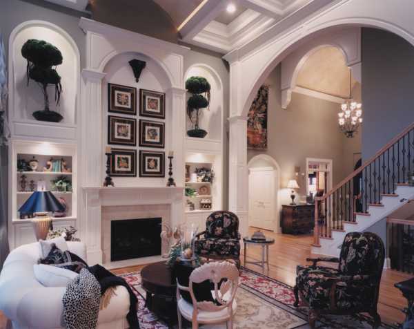 23. Дизайн внутри искусно соединяет старину с модой сегодняшнего дня. Уютная гостиная с мебелью на гнутых ножках и классическим камином легко и непринужденно соседствует с открытым проемом в стене, выходящим в столовую.