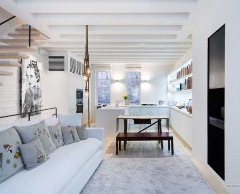 Ещё один весьма симпатичный вариант, в котором кухня-гостиная располагается внизу, спальня — наверху, а огромные окна служат идеальным решением для небольшого пространства. Белые стены, давая больше света, подходят любому интерьеру, но особо элегантно они смотрятся здесь, в помещении с небольшим метражом.
