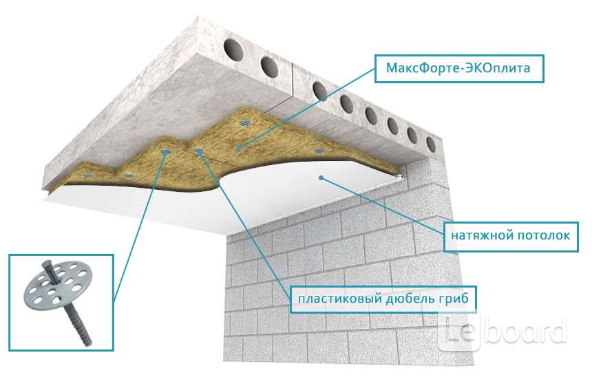 - При использовании теплоизоляционных материалов для звукоизоляции лучше, чтобы расстояние от натяжного полотнища до прикреплённого материала было не больше 20 мм. Это нужно для того, чтобы натяжная плёнка не служила резонатором звука.