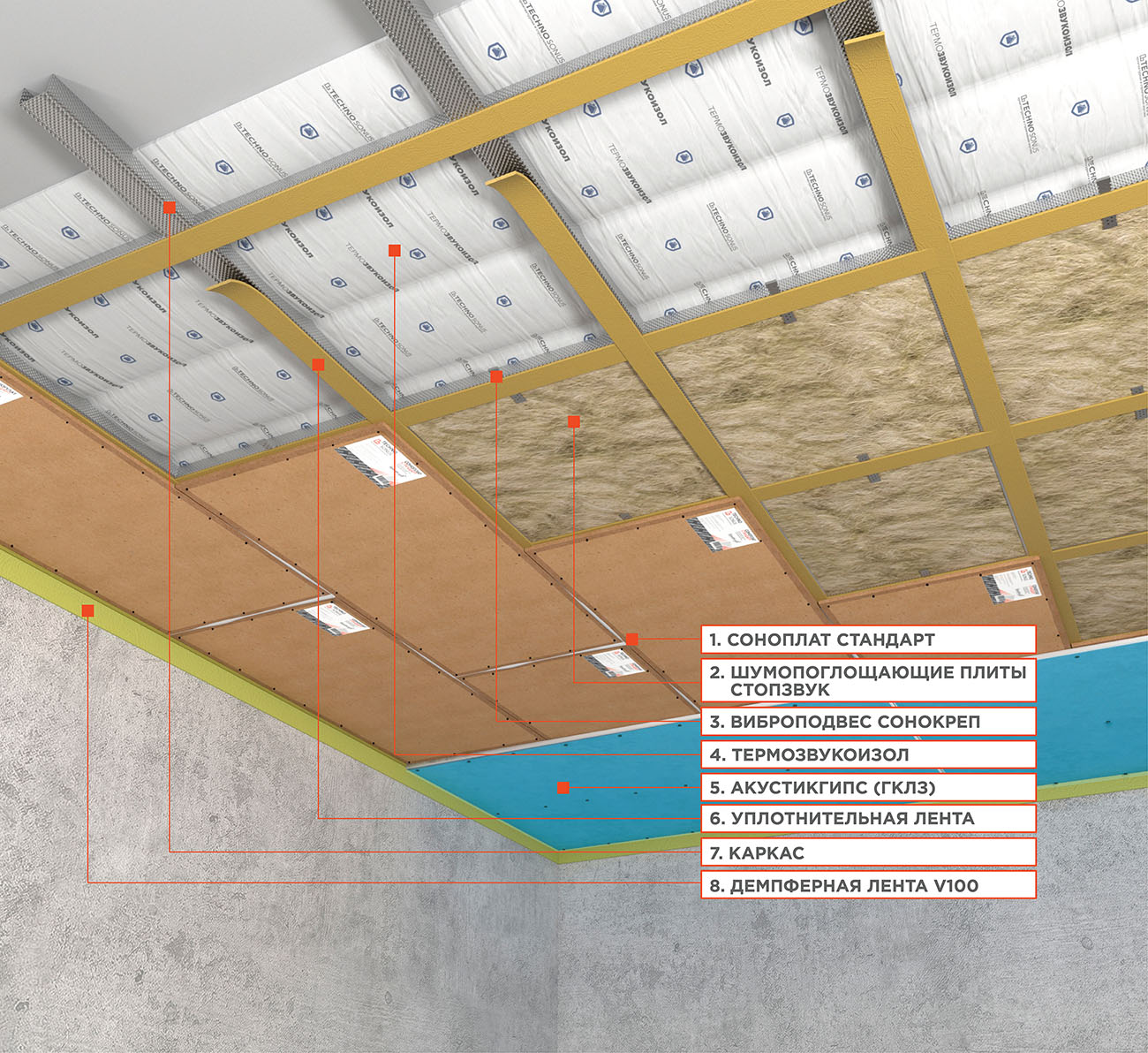 — подвесной потолок: состоит из шумоизоляционных листов.