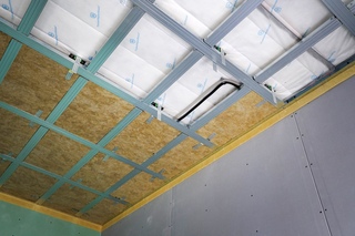 Самым распространенным способом звукоизоляции, который считается наиболее эффективным, является установка потолочного покрытия из минеральной ваты. Этот материал обладает высокой поглощаемостью шума. Монтаж его происходит аналогично монтажу других звукоизоляционных материалов. После этого каркас обшивается гипсокартоном, отделку которого можно произвести любым устраивающим вас способом.