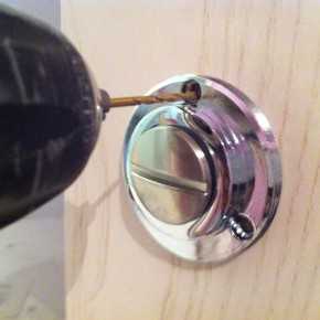 Если ручки поворачиваются туго, замок, вероятно, перекошен, чаще всего это происходит из-за того что выборка под пластину замка выполнена с неравномерной глубиной, и замок повернут в сторону, возможно также искривлена и сама выборка под замок, в первом случае выровняйте с помощью стамески и резцов дно выемки, во втором же случае – подровняйте стамеской стенки выборки. По аналогии с ручками установите завертку и проверьте ее работу. Если все установлено корректно, элементы можно закреплять. В комплекте с ручками, обычно, поставляются два вида креплений: маленькие шурупы-саморезы для крепления непосредственно к дверному полотну, а также две втулки с винтами, для крепления ручек методом их стяжки. Второй тип креплений рекомендуется использовать при невозможности использования первого. В нашем примере материал дверного полотна позволяет использовать саморезы.