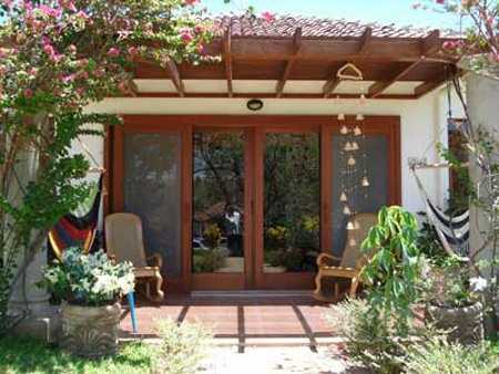 Пример оформления входа на южную сторону — терраса с крышей защищает большие окна до пола от проникновения солнечных лучей. Рядом с окнами витринами расположены кресла — качалки для отдыха.