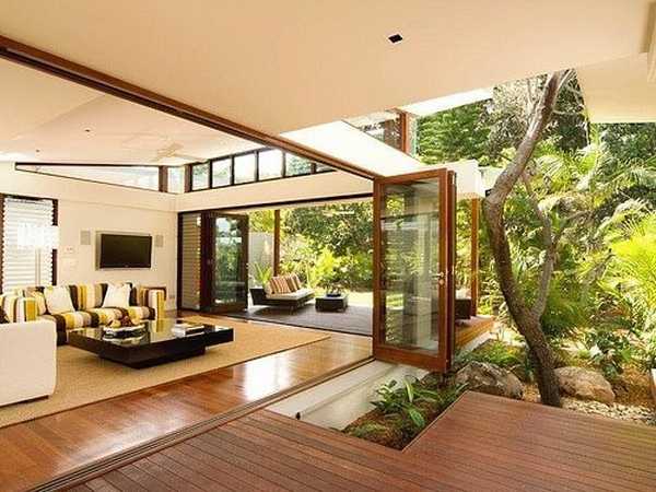 Большие окна в обустройстве интерьера хороши тем, что дают возможность людям, находящимся в помещении, сливаться с окружающей природой. Они объединяют внутреннее и внешнее пространство в одно целое. Наблюдая за деревьями, облаками человек чувствует умиротворение, его психологическое состояние стабилизируется. Кроме этого, освещенные в полном объеме комнаты, визуально становятся просторнее – выше и шире. В них нет необходимости создавать большое количество дополнительных источников искусственного света.