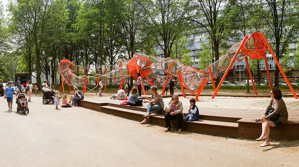 В его проекте абстрактная скульптура одновременно является игровой зоной. Японская художница и дизайнер Тошико Хориучи Макадам сделала для музея под открытым небом в Хаконэ детскую площадку в виде огромного гамака из разноцветных канатов, к которому со всех сторон прикреплены тарзанки, батуты, подвесные лестницы. На одной из улиц Амстердама ландшафтные архитекторы из бюро Carve создали сложный рельеф с холмами и ямами, c мягким резиновым покрытием, на котором расположили туннели, горки и другие аттракционы. Настоящий детский городок The Towers построили в Копенгагене: дизайнеры из компании Monstrum превратили игровую зону в уменьшенный макет датской столицы с ее самыми знаменитыми сооружениями. Дети могут залезть на верхушку ратуши или спрятаться внутри Круглой башни.