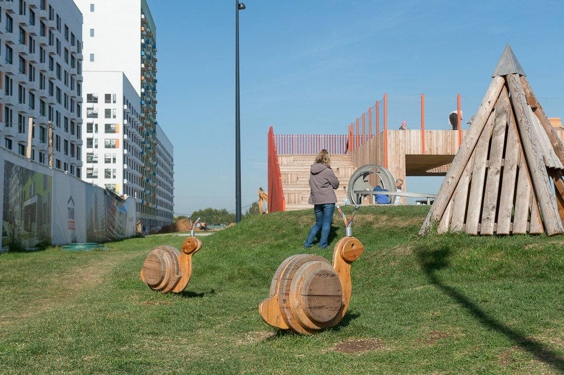 Рядом стоит типовая площадка, но в день открытия, конечно, весь двор собрался на новой: дети готовили сложные блюда из песка, камней и гороха, сочиняли музыку и скакали по бревнам. «Площадки из природного материала с абстрактными элементами имеют огромный игровой и развивающий потенциал, — говорит креативный директор проекта Baldu Kids Любовь Гурарий. — Почему-то в России пока этим никто не занимался». Baldu Kids сделали эту площадку по заказу холдинга RDI Group (девелопера «Ново-Молоково») и теперь будут наблюдать, как она используется, разговаривать с жителями и, похоже, продолжать работу по мере разрастания района.