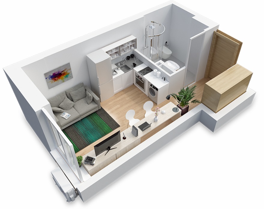 Используйте с умом все пространство. Например, хорошую службу могут сослужить встроенные шкафы-купе до потолка, подвесные кровати, выдвижные ящики для белья. Отдавайте предпочтение теплым, светлым оттенкам, а также глянцу и зеркальным поверхностям. Такие нехитрые манипуляции позволят зрительно расширить помещение. Хорошим решением также станет покупка квартиры с балконом, на котором можно организовать спальное место, кабинет или кухню.