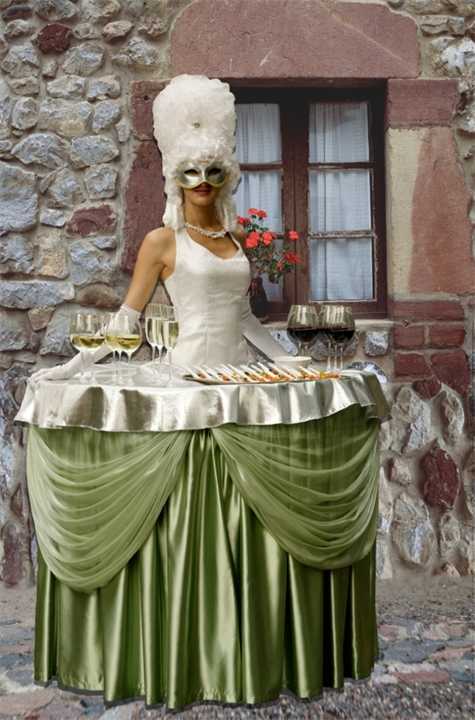 Для тех, кто морально не готов к такой степени глума над гостями, Джулия предлагает компромиссный вариант. Актер, а еще лучше – актриса, выглядит как обычный человек, одетый в широкую юбку. Вот только юбка одновременно является столом, на котором разложены легкие закуски и горячительные напитки. Надо отметить, что такой человеко-стол куда как полезнее. Ведь он может не только поддерживать беседу, но и разливать по рюмкам.