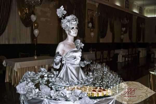 Кроме приглашения леди фуршет на мероприятие молодожены могут разнообразить свое торжество заказав леди фуршет на свадьбу. Она будет очень кстати, ведь это не только эксклюзивное шоу, но и модная «изюминка». Артистичная девушка фуршет, нарядное платье которой плавно переходит в… стол для выпивки и закусок, сделает ваше торжество еще более очаровательным. При этом девушка живой стол легко и непринужденно перемещается в своем облачении, успевая уделить внимание всем приглашенным и в это же время можно подойти к шаржисту, который сделает смешной шарж на память.