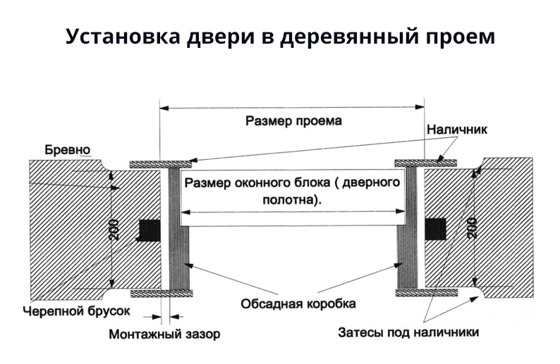 Итоговые габариты проёма также зависят от размеров профиля бруса дверной коробки, называемого стоевой. Как правило, его толщина в месте притвора составляет 30 мм, но бывают и нестандартные изделия, особенно часто в комплектах импортных дверей. Таким образом, горизонтальный габарит проёма составляет ширину дверного полотна, которая может быть от 60 до 100 см, плюс две стоевые по 30 мм, плюс 6 мм зазора и не менее 40 мм пенного шва. Высота проёма составляет длину дверного полотна (200 см стандарт и 190 см для санузлов), плюс верхний зазор в 3 мм, плюс нижний зазор, который может составлять 10–25 мм в зависимости от наличия на полу коврового покрытия или уплотнительной щётки на двери.