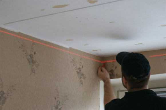 - Прежде чем начать монтаж потолка своими руками, нужно определить высоту каркаса. Для этого от самой низкой точки основного потолка нужно отступить, как минимум, 25мм, на толщину профиля CD и поставить на стенке метку. Затем, при помощи водяного или лазерного уровня, перенести эти метки во все углы помещения.