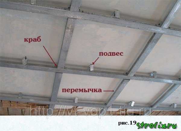 После этого, при помощи соединителей «краб», монтируются короткие части каркаса, которые располагаются поперек конструкции, и на этом, его сооружение тоже заканчивается. Остается начать и закончить крепление гипсокартона к потолку.