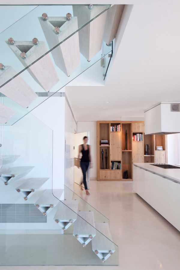 - Парящие ступеньки. Стены имеют ровную белую гамму, соединенную с прямыми деревянными панелями. Обшивка плавно разворачивается, что возводят создать консольную лестницу. Ее ограничением выступает стена из стекла.