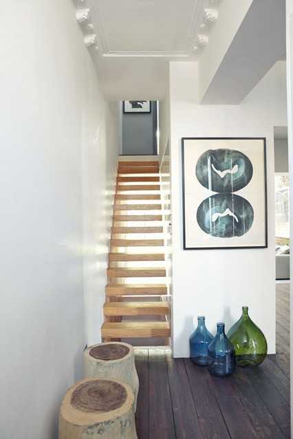 Все гениальное просто, как гласит народная мудрость. Окрасьте стены, к которым примыкает деревянная лестница, в молочно-белоснежный цвет и вы увидите, как эффектно натуральное дерево будет смотреться на этом фоне. А сами ступени, как повиснут в воздухе.
