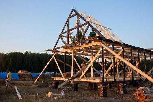 Крыша кроется сразу же, чтоб при укладке соломенных блоков в стены каркаса они не намокли от внезапной непогоды и дождя.
