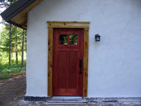 Блоки соединялись специальными деревянными штырями, а стыки между блоками плотно затрамбовывались свободной соломой. Затем стены подстригли электропилой для выравнивания, углы обложили мелкой металлической сеткой, после чего снаружи был нанесен первый слой раствора глиняной штукатурки. Технология требует наносить три слоя штукатурки (по 1 см каждый) снаружи и изнутри дома.