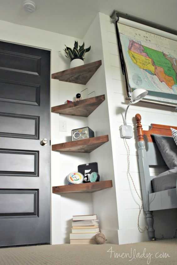 Развесить полки в углу — идея не новая, но всегда актуальная. Это могут быть полки для фотографий и милых безделушек или книг. Необязательно чтобы они были привычного формата. Чем интереснее форма и цвет этих элементов интерьера, тем изящнее будет смотреться дизайн угла.