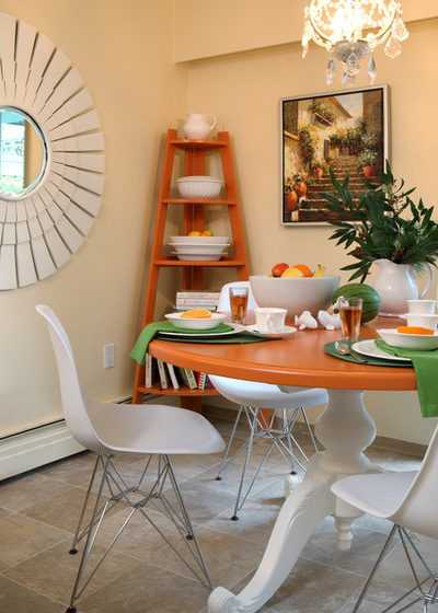 Маленький круглый столик с четырьмя стульчиками, поставленный в углу, станет хорошим вариантом для квартир с маленькими кухнями. Прекрасной эконом идей будет использовать старый стулья или стул . Как покрасить стулья — смотрите здесь.