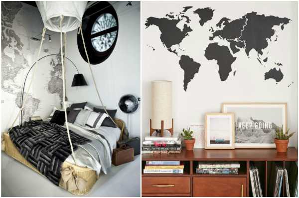 Очень популярен текстиль с изображением континентов и стран. Подберите детали в зависимости от выбранного стиля: декоративные диванные подушки, постельное белье или шторы на окнах.