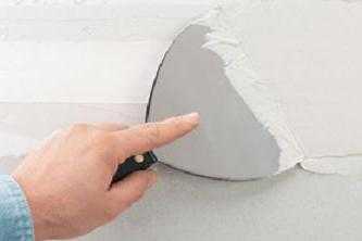 Нанесение клея на лист гипсокартонаПроизвести эту работу можно с применением перфоратора с определенной насечкой или простым топором. Если в стене есть трещины или выбоины, их нужно заделать раствором штукатурки или запенить. Монтажная пена проникнет глубоко в трещину, заполняя ее на всю глубину. После того как пена высохнет, ее нужно срезать заподлицо со стеной.