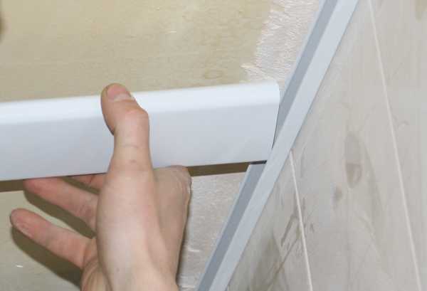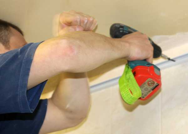 Монтаж пристенного профиля | По сделанной разметке последовательно закрепите на стенах направляющий профиль или уголок. Для этого сквозь него просверлите в стене отверстие дрелью, вставьте в него дюбель и вкрутите шуруп. Шаг крепления – 50-60 см. |