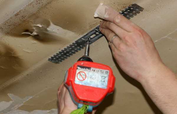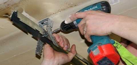 - Просверлите отверстия в потолке и с помощью дюбелей и саморезов установите подвесы.