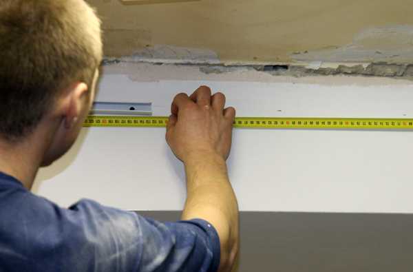 - В любом угла отступите от потолка расстояние, на которое желаете опустить потолок и поставьте там метку.