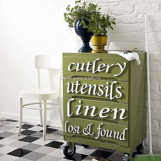 Сделайте большие буквы любого понравившегося Вам шрифта в соответствии с пропорциями Ваших ящиков передней или отформатируйте текст в Microsoft Word или Adobe Illustrator и сходите в фирму, которая вам поможет вырезать буквы из МДФ. Выньте ящики и покрасьте их лицевую сторону и боковые части в два слоя глянцевой краской, затем проделайте то же самое и с самим шкафом (кроме задней стенки). Приклейте каждую букву с помощью столярного клея. Приделайте колесики к шкафу, это придаст ему модный, современный вид.