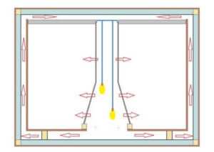 Заполнять теплоизоляцией зазоры не нужно. Между коробами образовалось вентиляционное пространство. Чтобы циркуляция работала, стенки меньшего ящика перфорируют сверлом 10-12 мм. Обогрев делают из лампочек. Понадобится установить перфорированный корпус из стальной трубы или деревянных досок. Там, где нижний торец кожуха упирается в дно меньшего ящика, прорезают отверстие. Через него тепло будет циркулировать по вентиляционному пространству и обогревать все стенки контейнера.